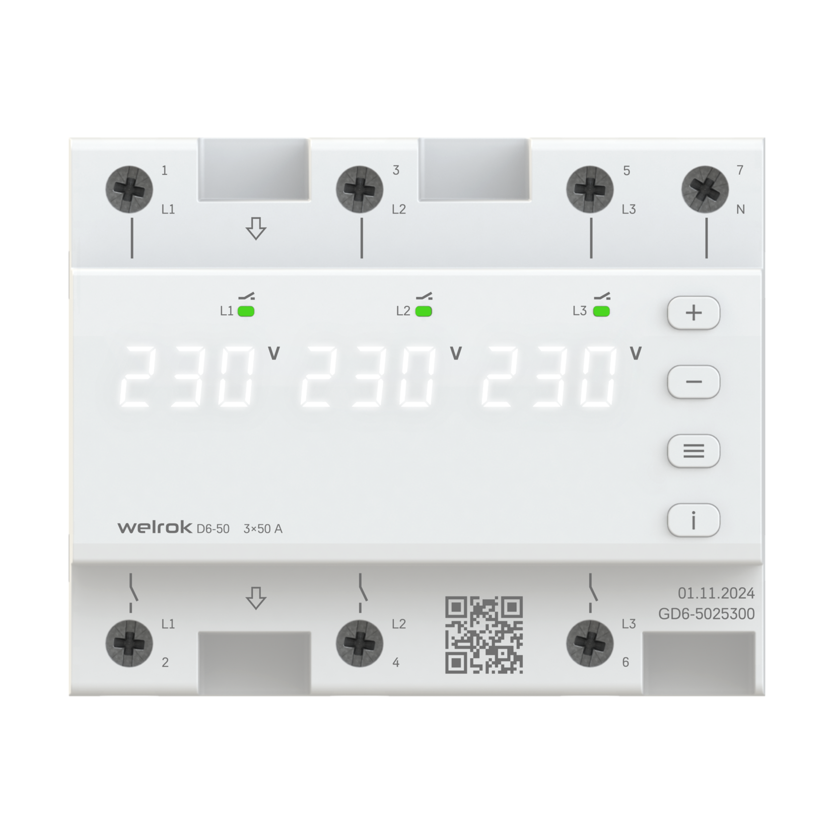 Реле напряжения Welrok D6 защищает электрооборудование от критических скачков напряжения в сети, занимает 6 модулей и может работать в режиме однофазной или трехфазной нагрузки.