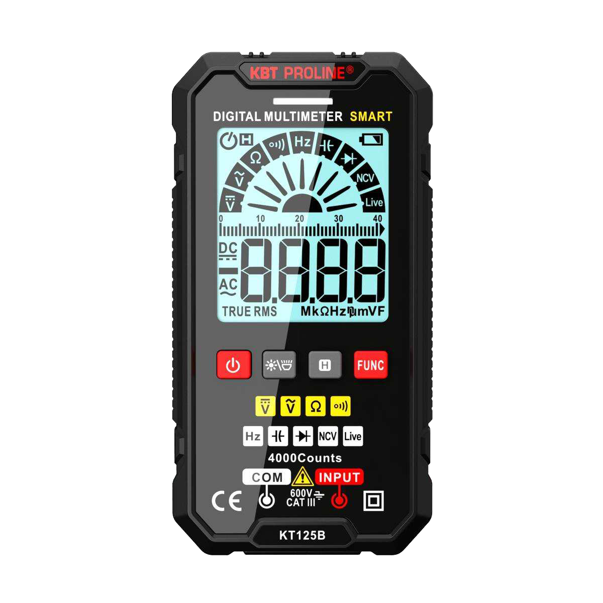 Мультиметр цифровой с True RMS модель: КТ 125В Серия PROLINE - Многофункциональный цифровой мультиметр со среднеквадратическим методом измерения значений – True RMS, большим ЖК-дисплеем и удобной шкалой выбора режима измерений. - Параметры измерений: - постоянное напряжение: 400 мВ – 600 В - переменное напряжение: 4 В – 600 В - сопротивление: 400 Ом – 40 Мом - емкость: 4 нФ – 4 мФ - частота: 40 Гц – 4 МГц - ЖК-дисплей с диагональю 2.55″ - Определение переменного напряжения бесконтактным способом - Звуковая и цветовая индикация нейтрали/фазы - Автоматический выбор пределов измерений - Режим «прозвонка», диод-тест - Количество измерений в секунду: 3 - Разрядность дисплея: 4000 отсчетов - Функция MAX/MIN - отображения максимального и минимального значения показаний - Функция DATA HOLD - Функция подсветки рабочей области и дисплея - Автоматическое отключение прибора: по истечении 15 минут бездействия - Батарейки: 1.5 В ААА, 2 шт - Вес с батарейками: 128 г - Габариты: 127х66х20 мм - В комплекте: мультиметр, измерительные щупы, батарейки, защитная сумка, инструкция Сертификация - Декларация соответствия на мультиметры КВТ-PROLINE (EAC) [ https://mti.by/%D0%A1%D0%B5%D1%80%D1%82%D0%B8%D1%84%D0%B8%D0%BA%D0%B0%D1%82%D1%8B%20%D1%81%D0%BE%D0%BE%D1%82%D0%B2%D0%B5%D1%82%D1%81%D1%82%D0%B2%D0%B8%D1%8F%20EAC/sert-eac-measure.pdf ] Документация Эксплуатационно-гарантийные сроки - Гарантийный срок хранения 5 лет - Гарантийный срок эксплуатации 1 год - Срок службы 3 года SKU товарные позиции Тип прибора Серия Функциональные режимы Индикация Разрядность дисплея, количество знаков TRUE RMS Диапазон измерения постоянного напряжения, (В) Диапазон измерения переменного напряжения, (В) Диапазон измерения постоянного тока, (А) Диапазон измерения переменного тока, (А) Диапазон измерения сопротивления тока, Ом Диапазон измерения электрической емкости, Ф Диапазон измерения частоты тока, Гц 86325 KT 125В PROLINE (КВТ) мультиметр PROLINE подсветка рабочей зоны/ MAX/ подсветка дисплея/ прозвонка/ DATA HOLD/ бесконтактное измерение/ MIN/ диод-тест/ автоматическое отключение разряда батареи 4000 0.4 ... 600 4 ... 600 6000 мкА ... 600 мА 6000 мкА ... 600 мА 400 Ом ... 40 МОм 4 нФ ... 4 мФ 40 Гц ... 4 МГц